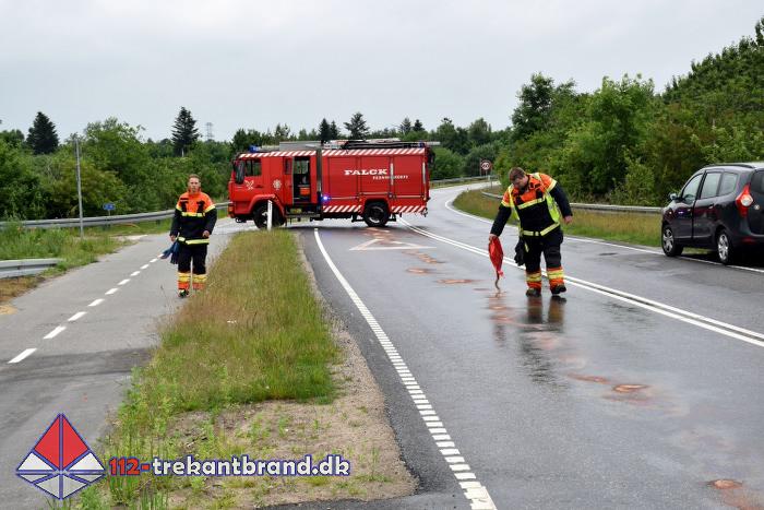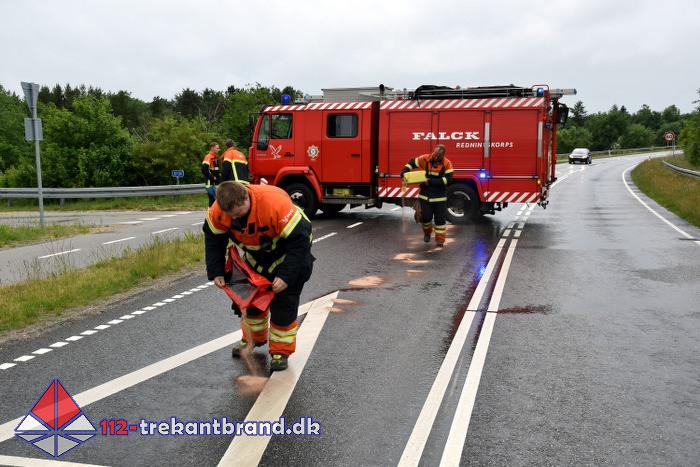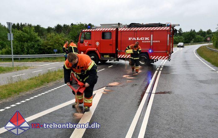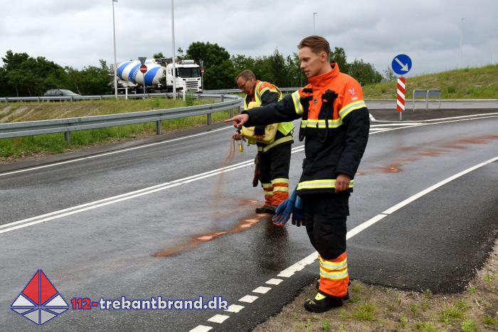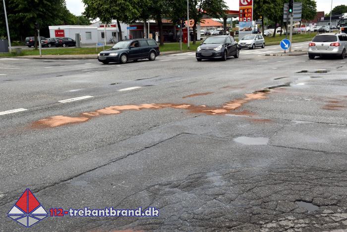 Et eller andet køretøj havde lækket dieselolie på vejbanen på Gestenvej, rundkørslerne over motorvejen, Koldingvej og Engvej.