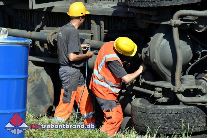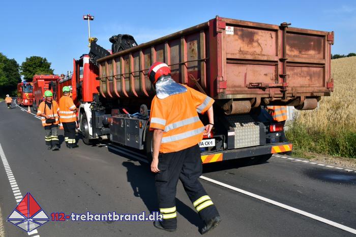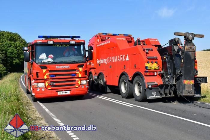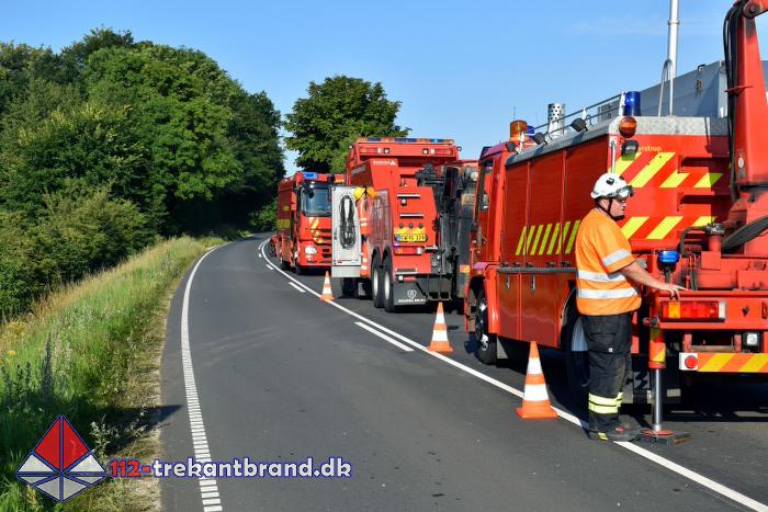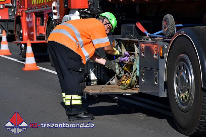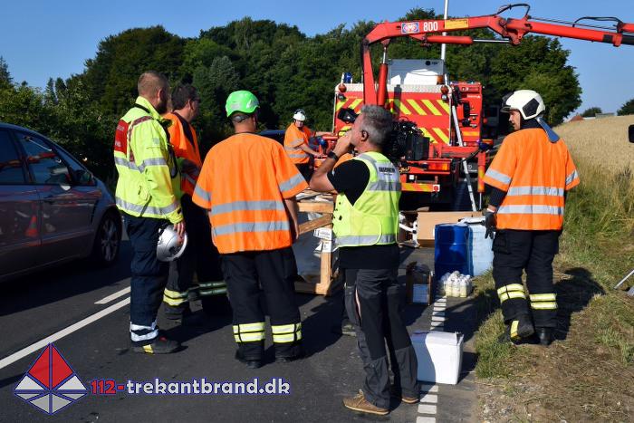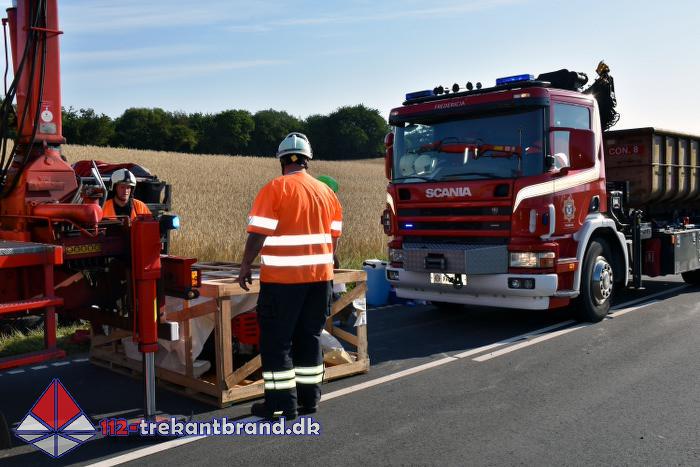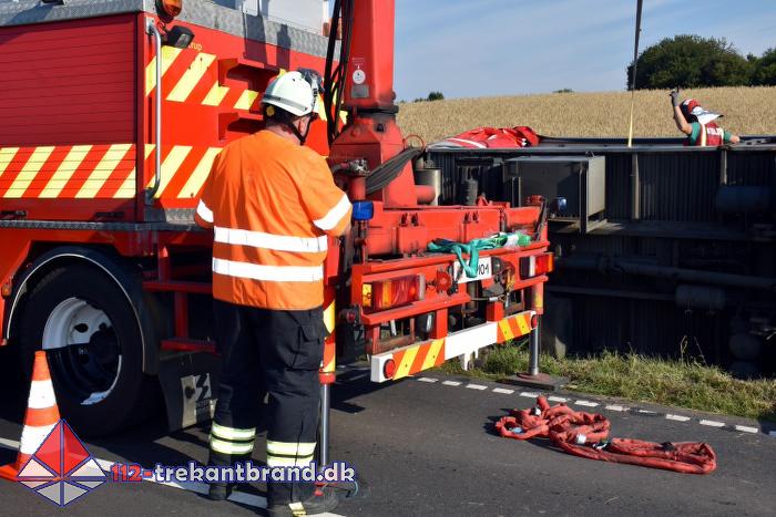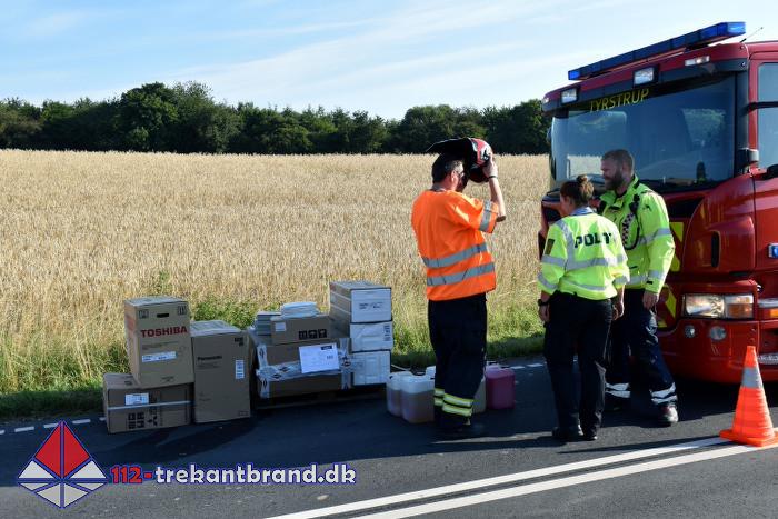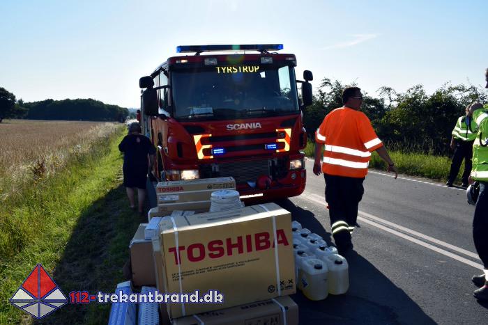 TrekantBrand fra station Tyrstrup var hurtigt fremme på stedet og klokken 08:09 blev station Stepping kaldt til assistance, da lastbilen skulle tømmes.
