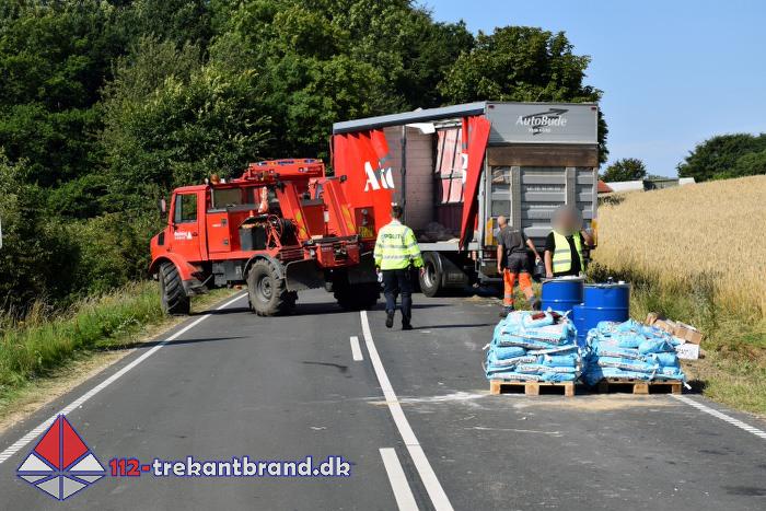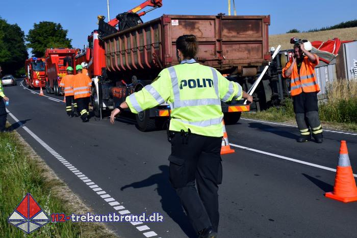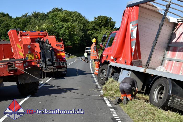 Flere vogne fra Redning Danmark fik lastbilen på vejen igen, og mens dette arbejde stod på var landevejen spærret for al trafik.