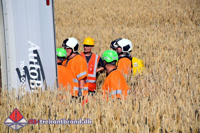 En lastbil kom for tæt på rabatten med det resultat at den endte på siden inde i en kornmark.
