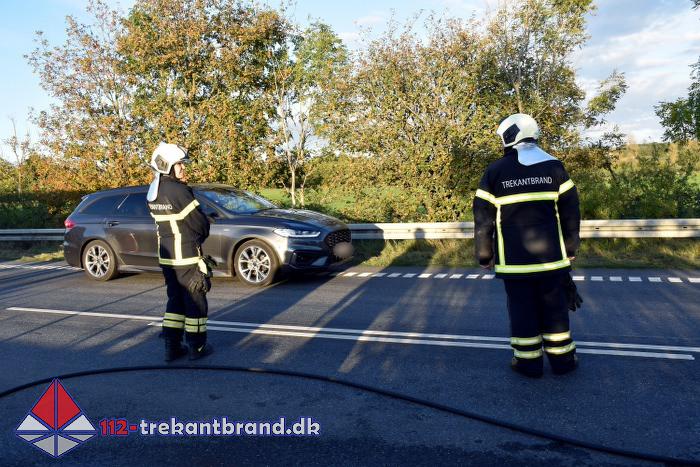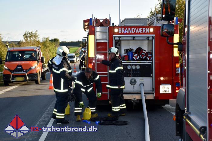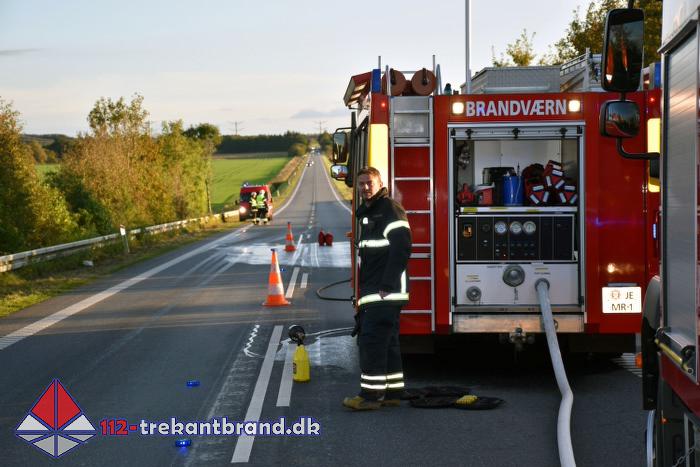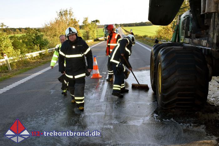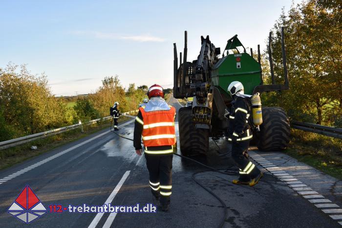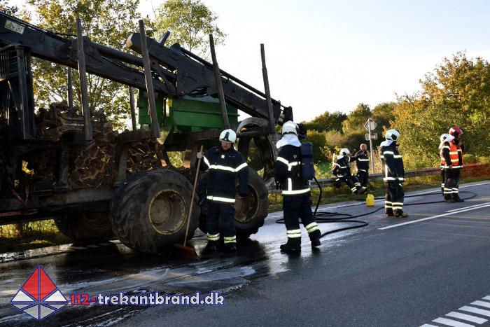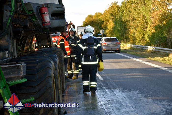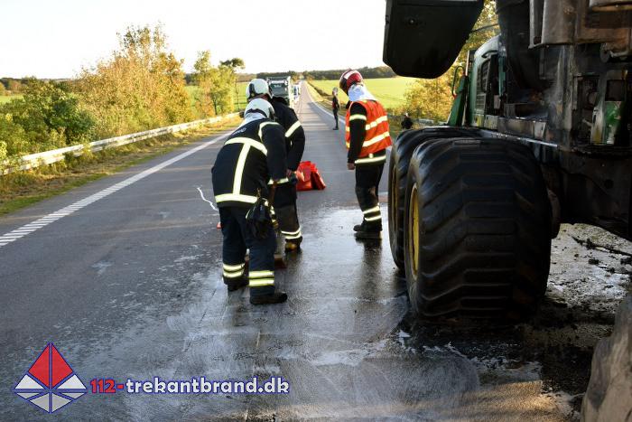De altid friske brandmænd m/k fik ilden under kontrol og vejen rengjort men skovmaskinen kunne selvsagt ikke selv køre fra stedet !