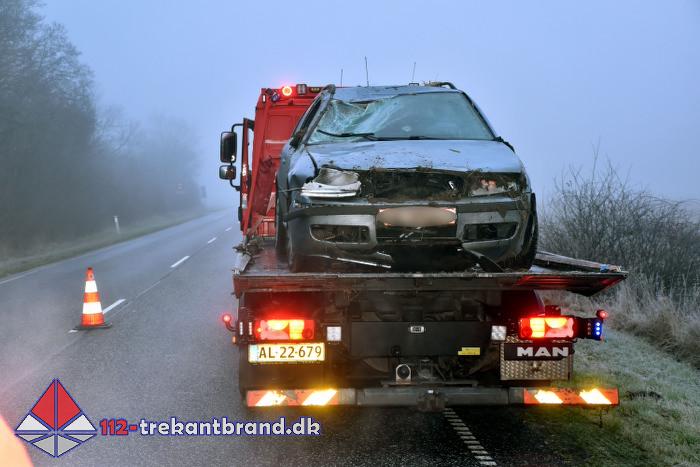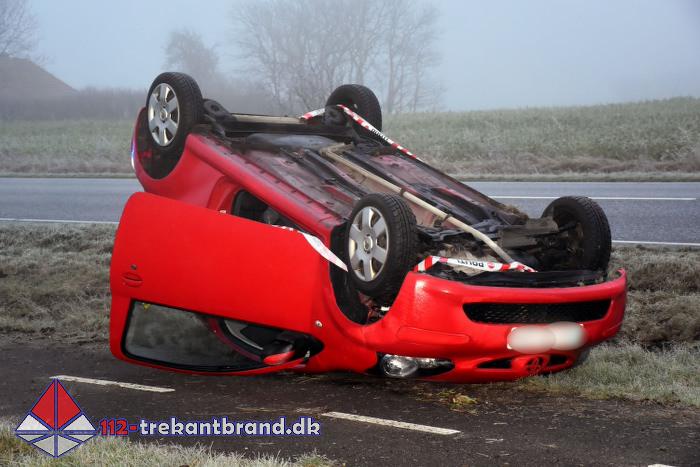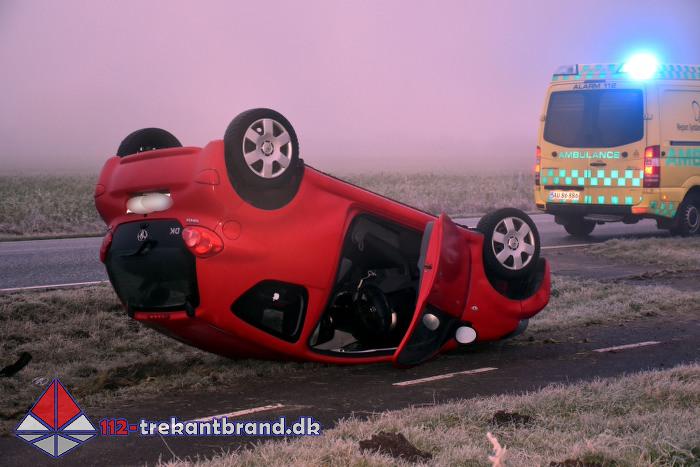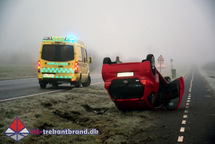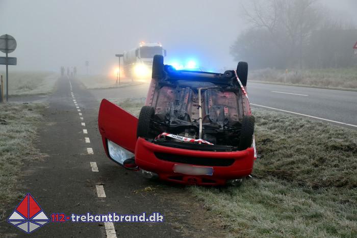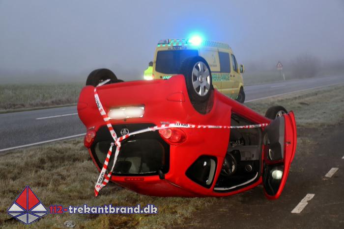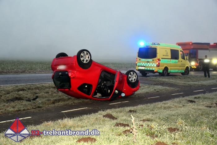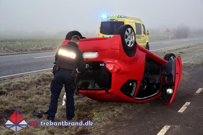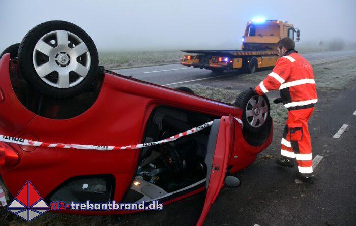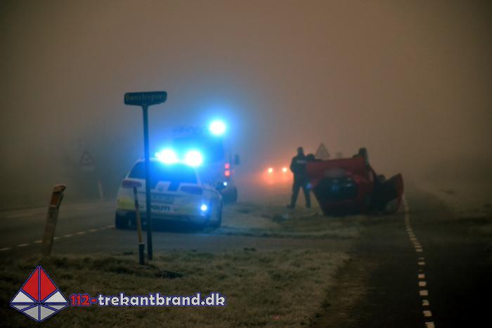Det ene uheld skete ved Koldingvej / Bønstrupvej, hvor en kvinde mistede herredømmet over bilen og endte på taget.