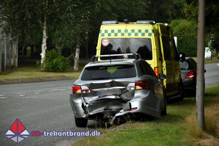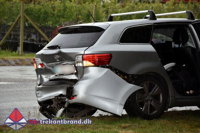 En personbil var kørt op bagi en venstresvingende bil med det resultat at begge biler blev slemt beskadiget.