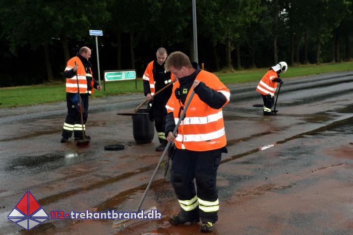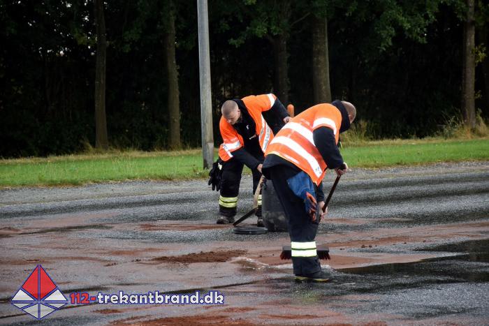 Vejkrydset var spærret i en times tid da TrekantBrand, station Vejen, måtte have godt gang i “ kattegruset “ efter at et regnvejr satte ind og vejbanen blev meget glat.