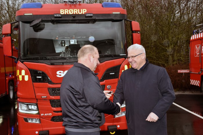 Det var borgmester i Vejen Kommune, Frank Schmidt-Hansen, der havde fornøjelsen af at overrække nøglerne til de to splinter nye brandbiler som fandt vej til TrekantBrand i går.