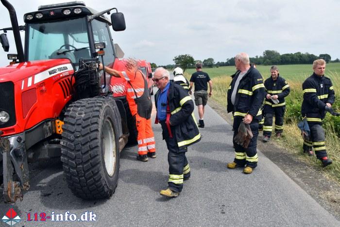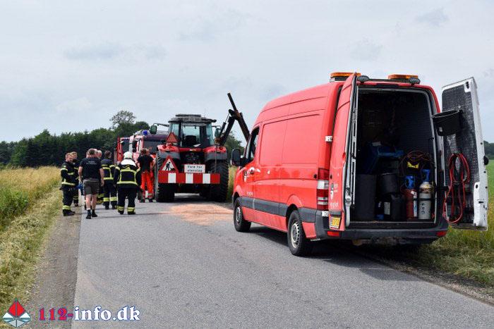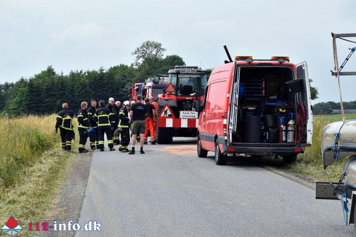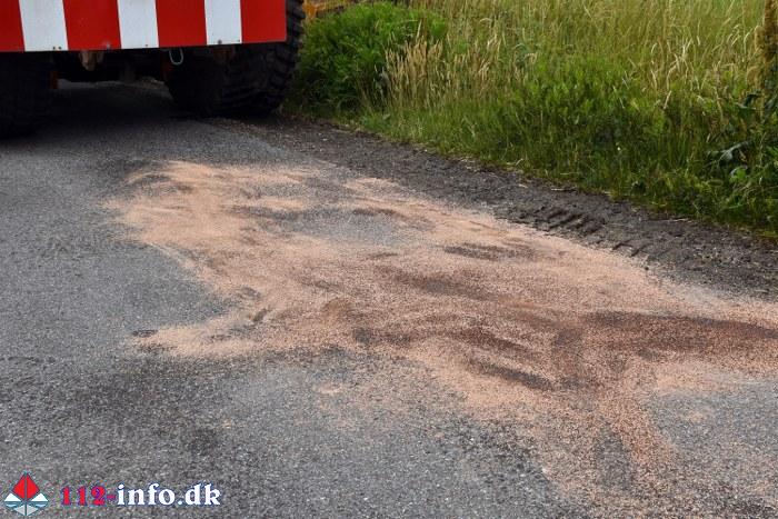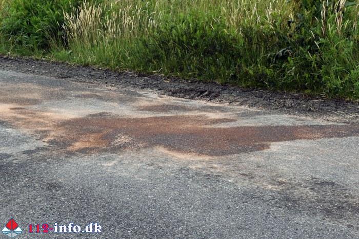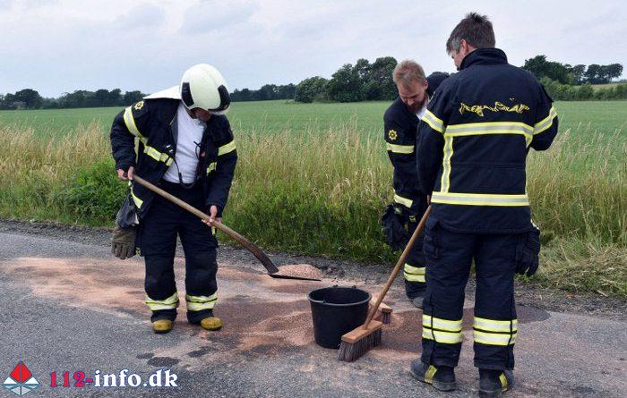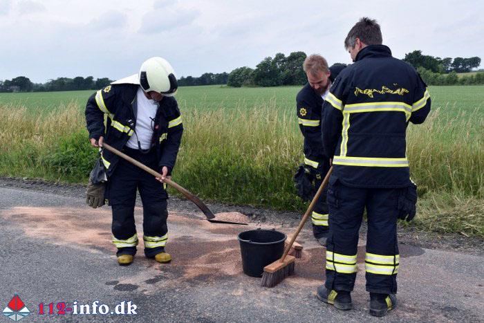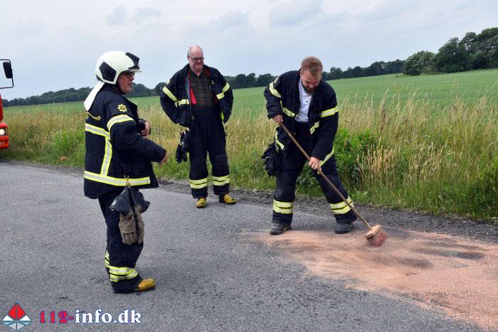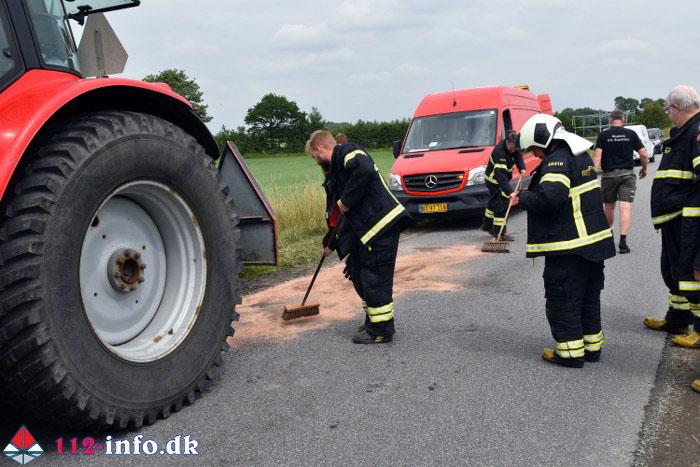 På en kort vejstrækning havde en traktor smidt lidt hydraulikolie og brandfolkene blev tilkaldt til alarmen om en mindre forurening / mindre spild.