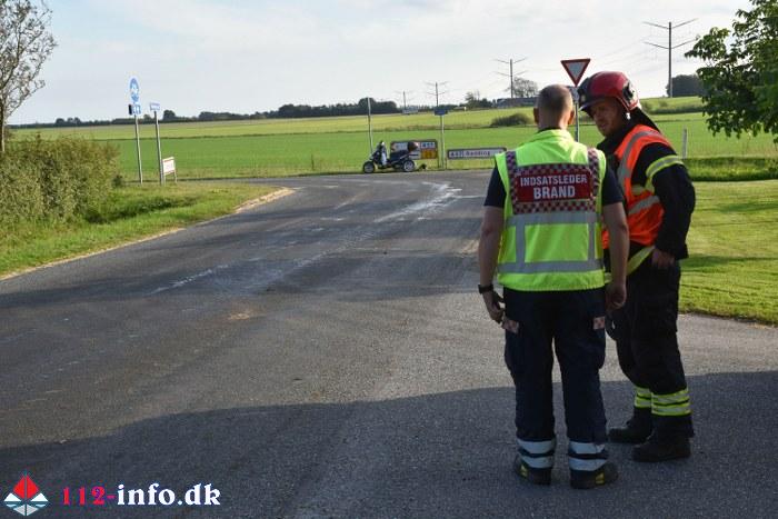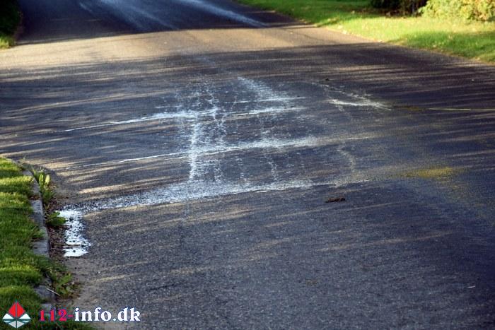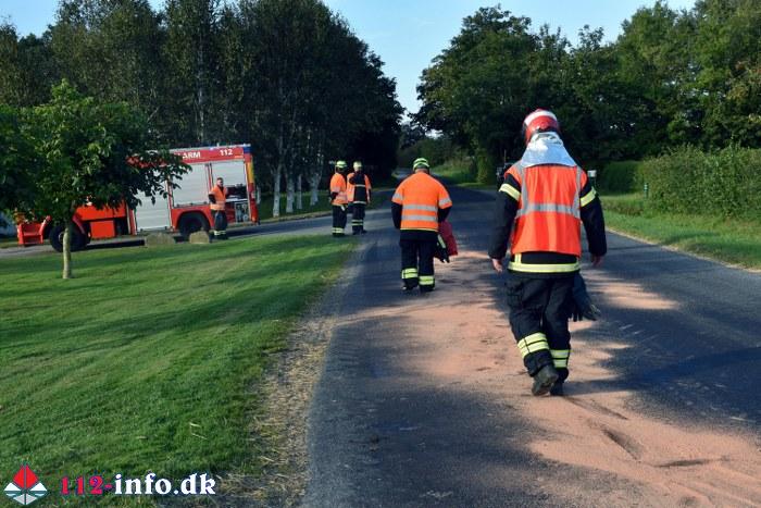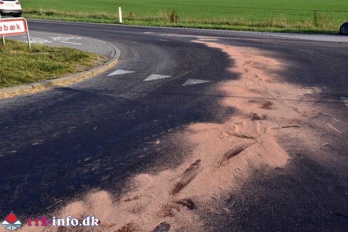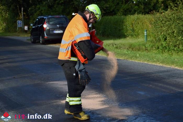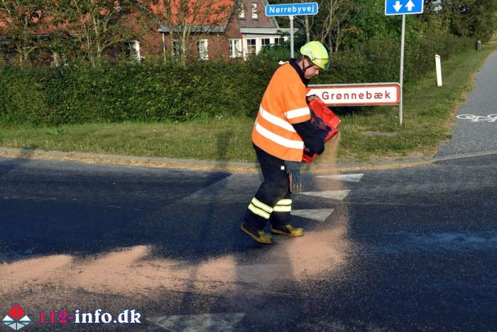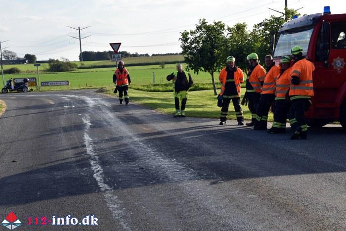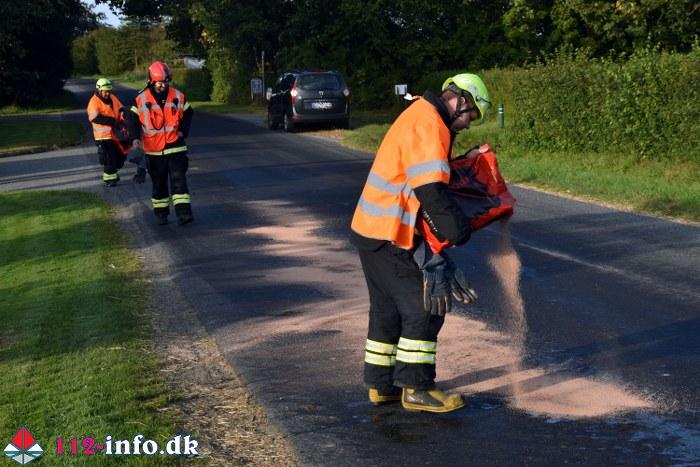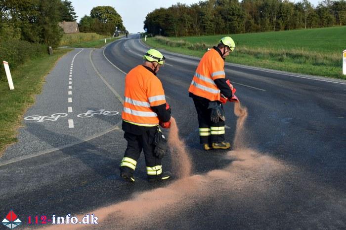 Det viste sig at være spild fra en traktorvogn der lækkede ensilage på vejbanen og et par forbipasserende fandt vejen glat og ringede til alarmcentralen.