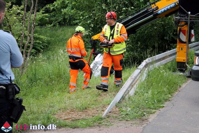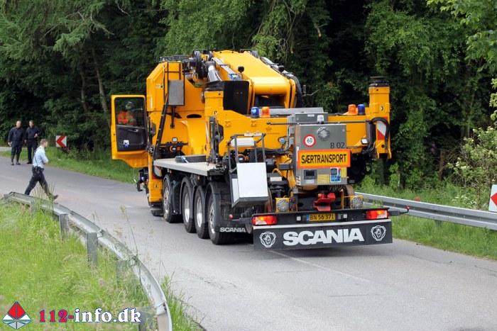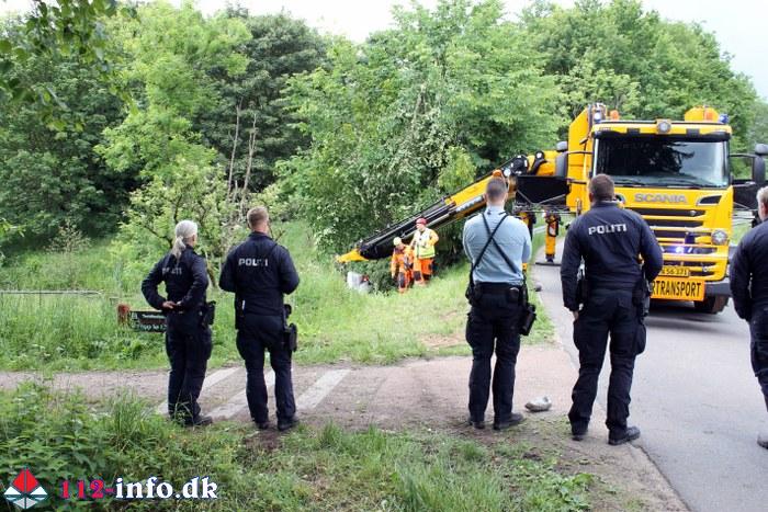 En stor kran fra Banedanmarks Beredskab ankom til stedet, kranen skulle løfte bilen op af åen.