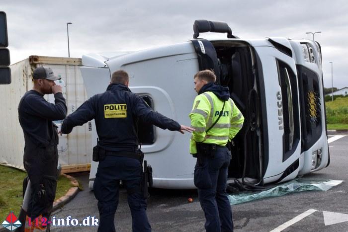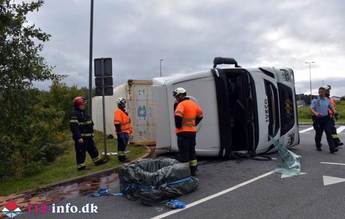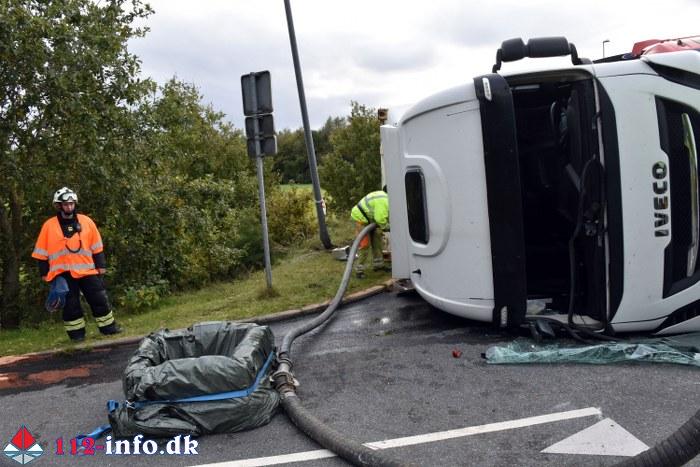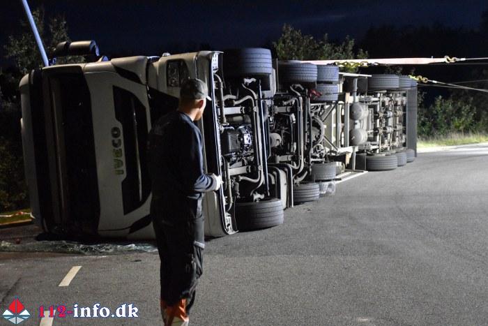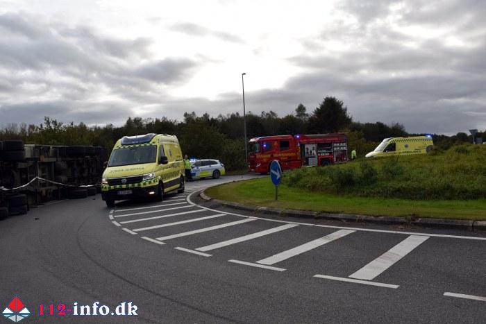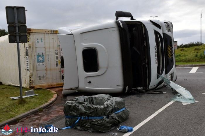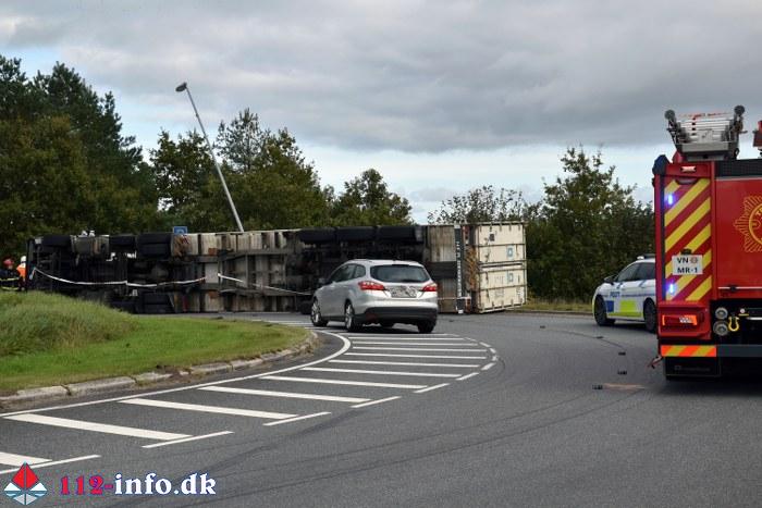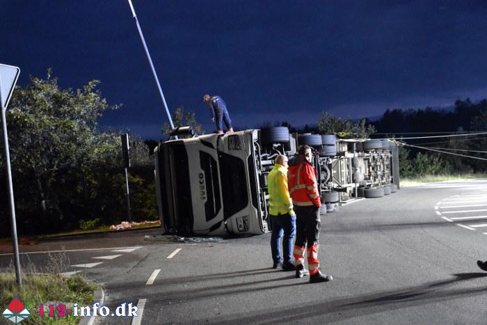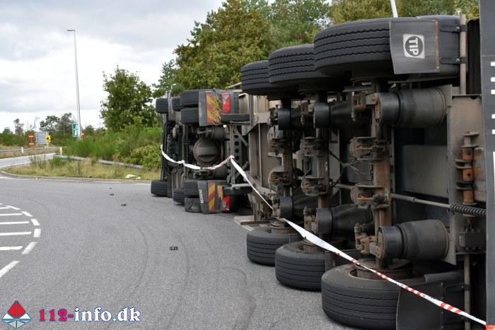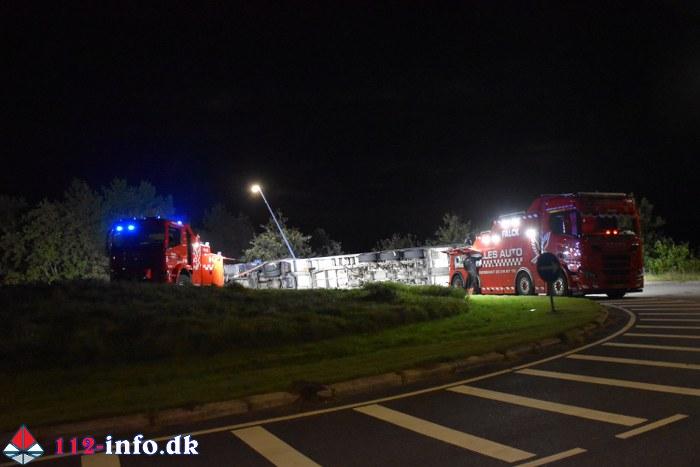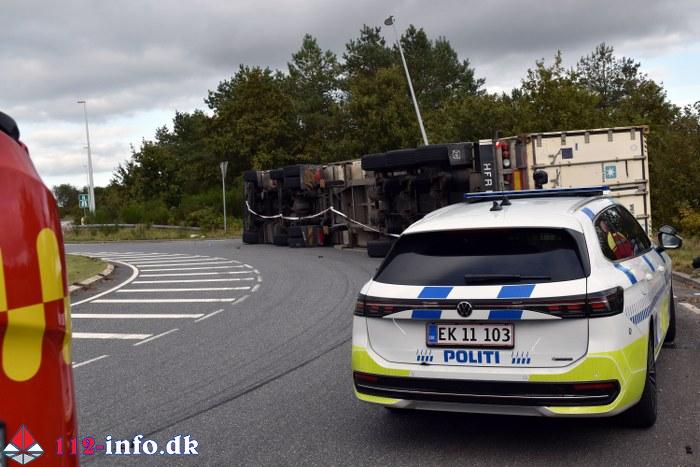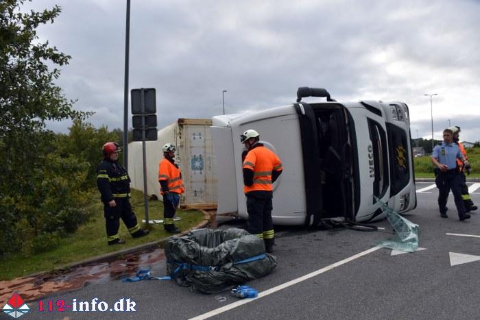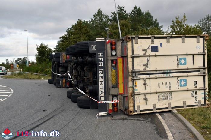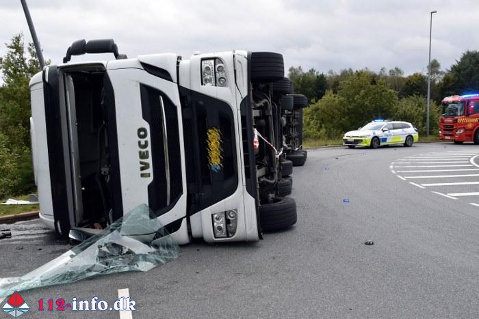 Lastbilen, en sættevogn, væltede om på siden sikkert grundet for høj hastighed ved indkørsel i rundkørselen.