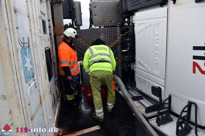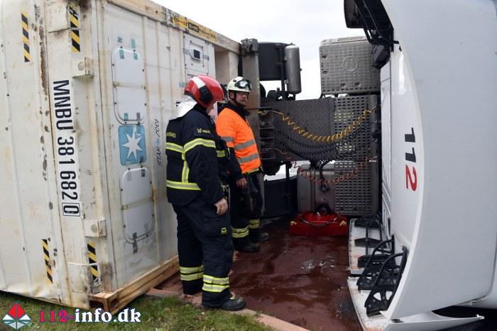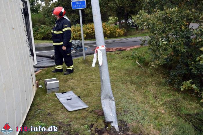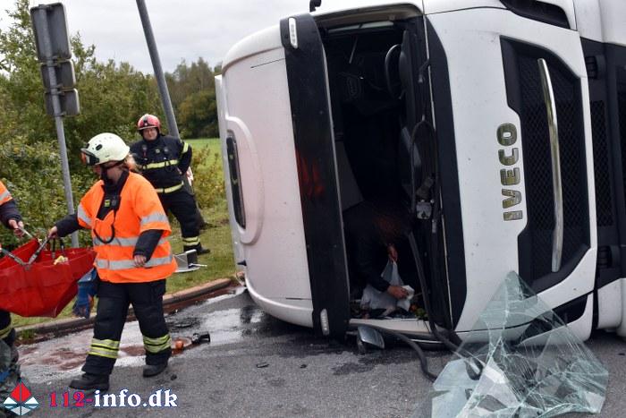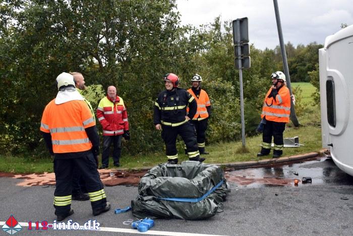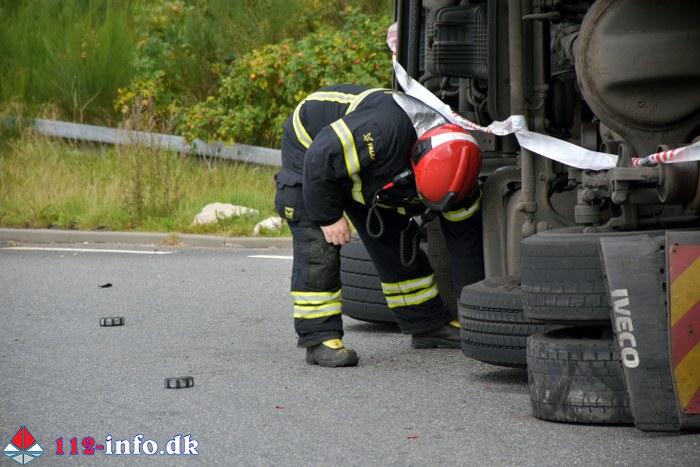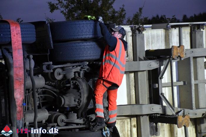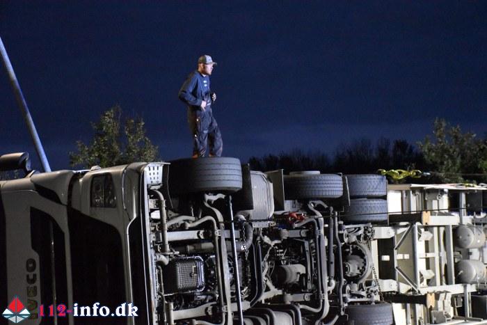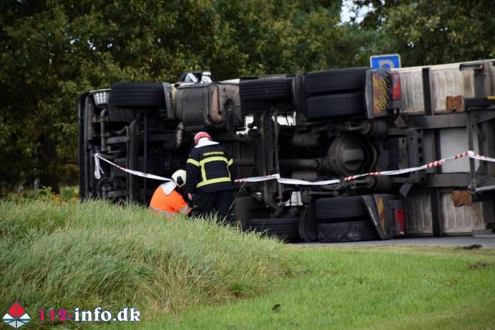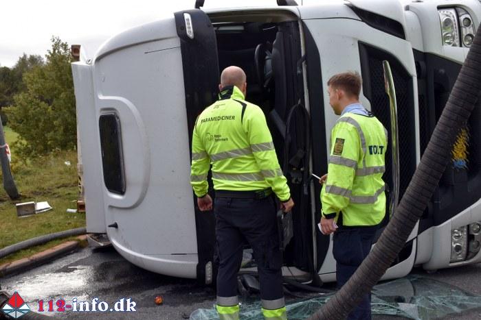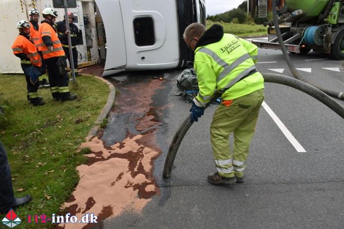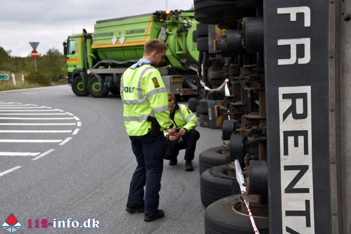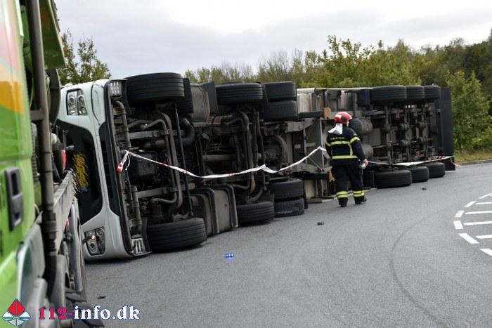 Lastbilen, en sættevogn, væltede om på siden sikkert grundet for høj hastighed ved indkørsel i rundkørselen.