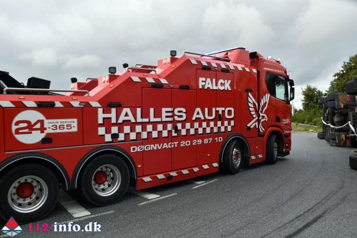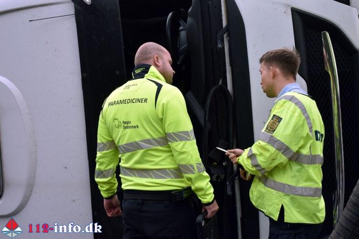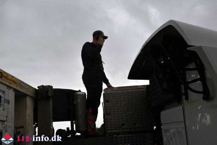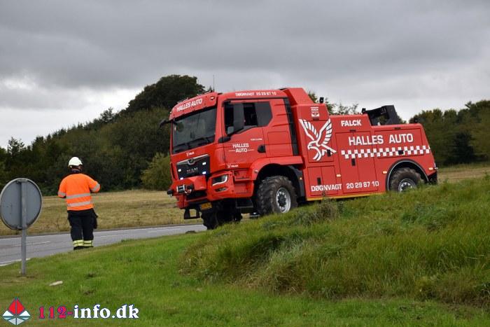 Mandag eftermiddag, klokken 15.41, væltede en stor lastbil i rundkørselen ved tilkørslen til motorvejen og Gestenvej ved Vejen.