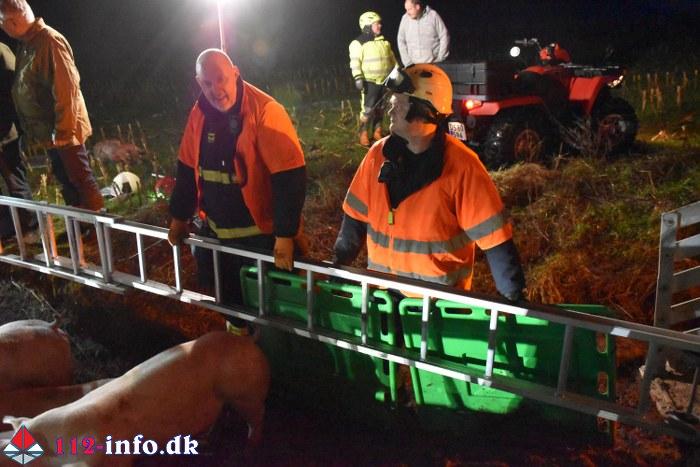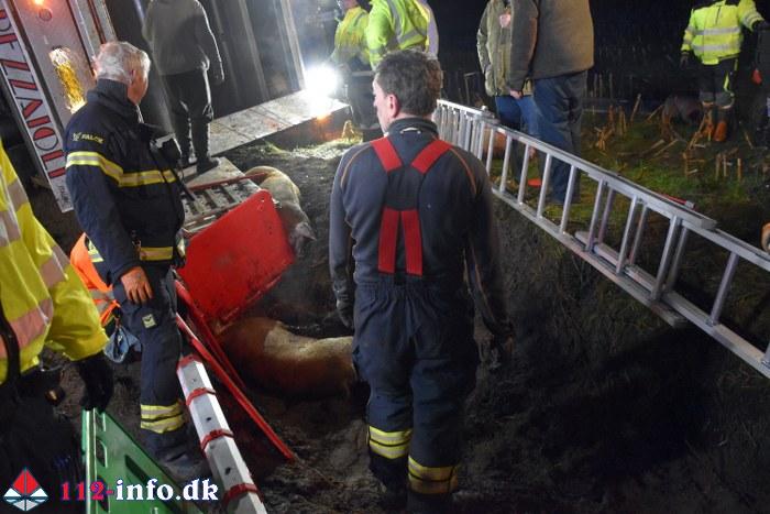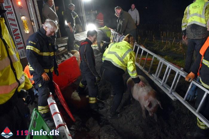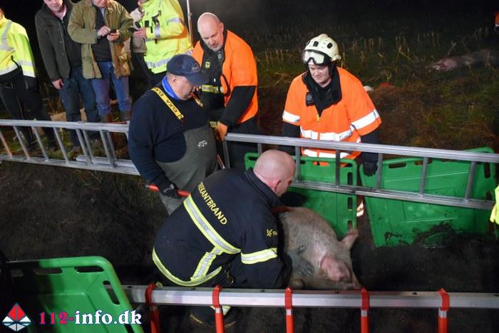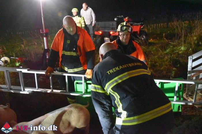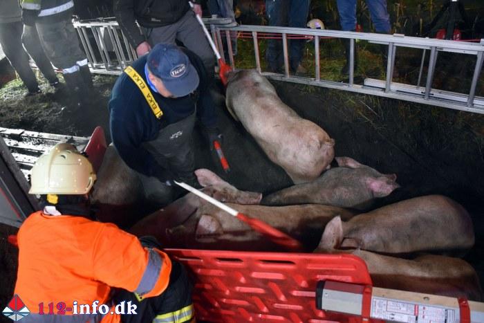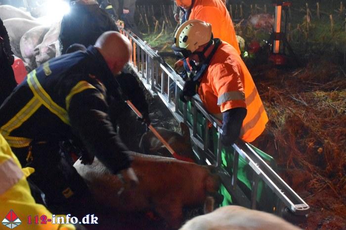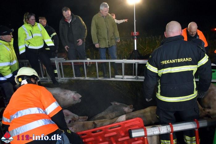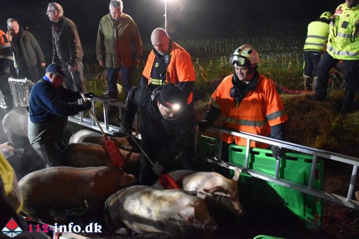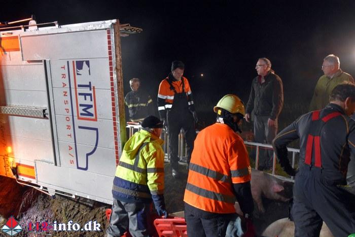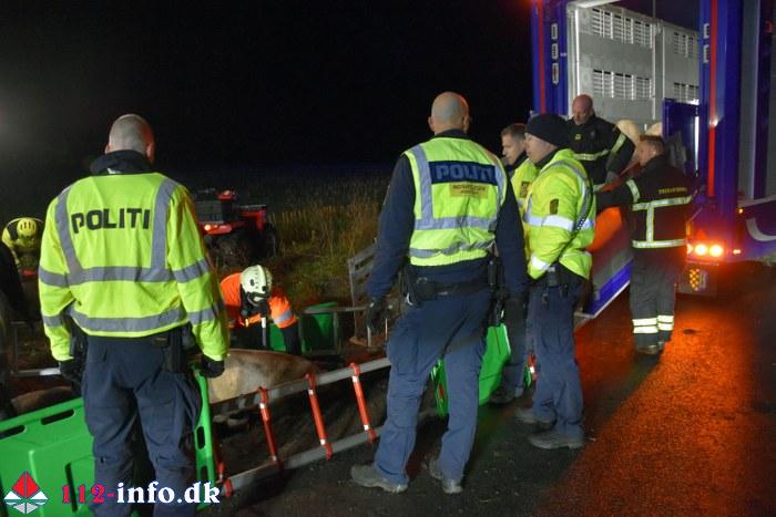 I den mørke aftenstund, tirsdag klokken 18.05 væltede en grisetransport ved Brørup.