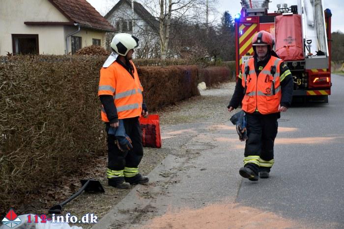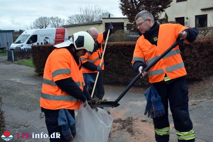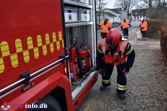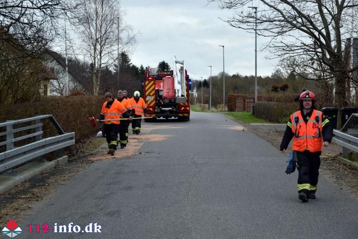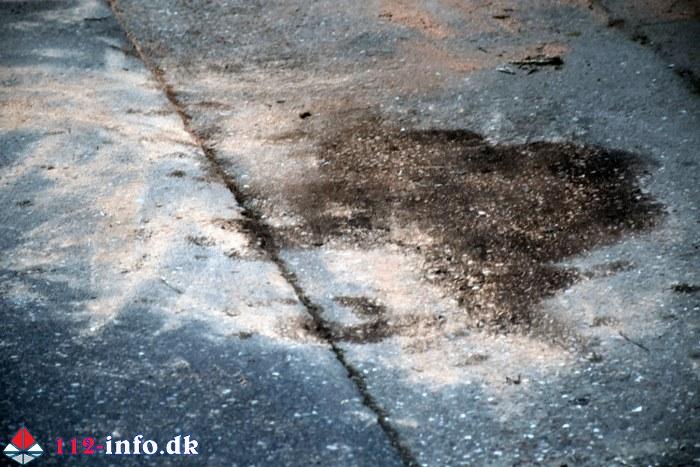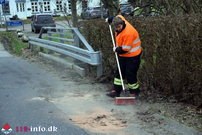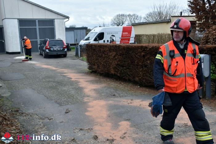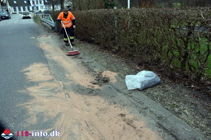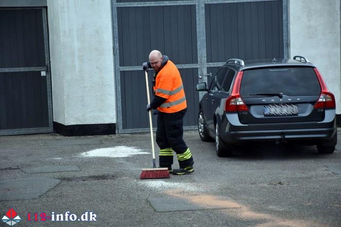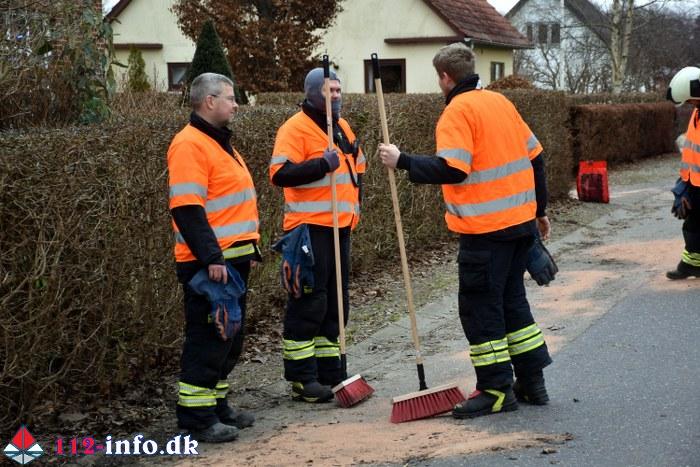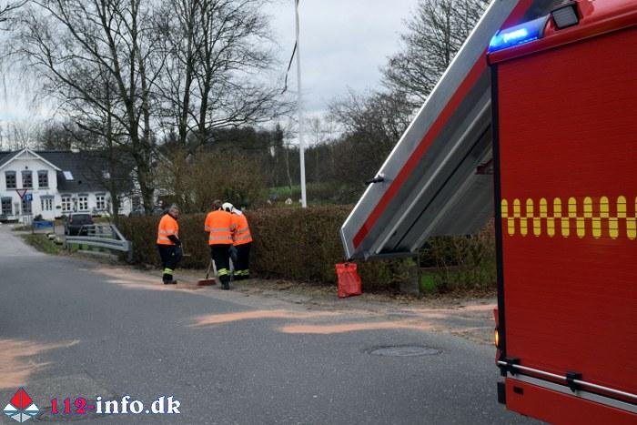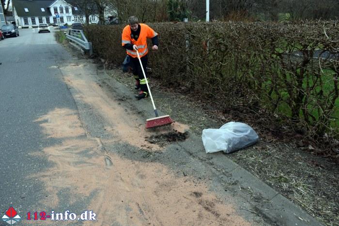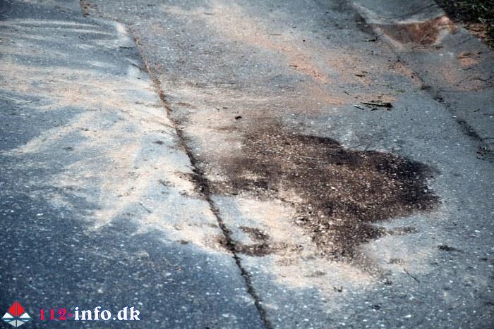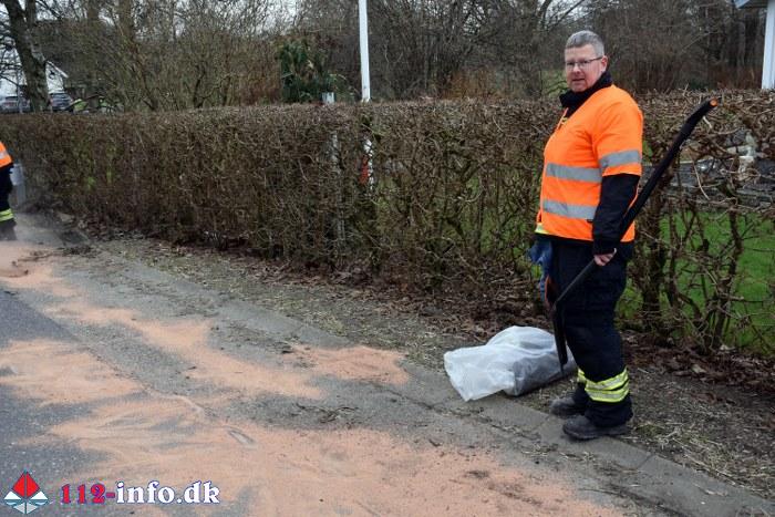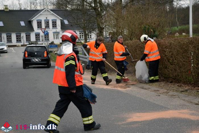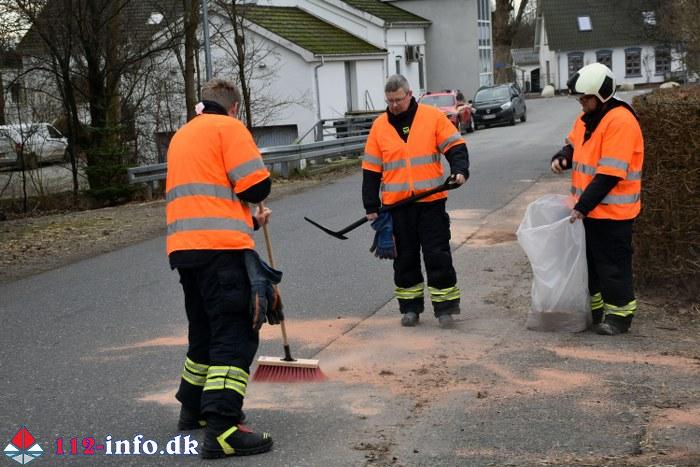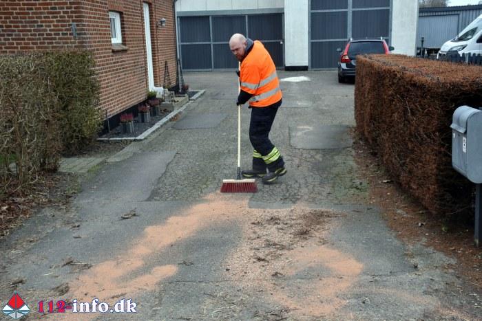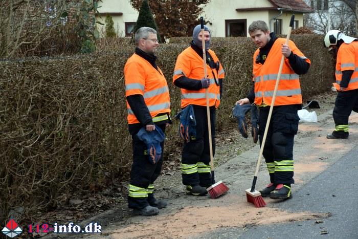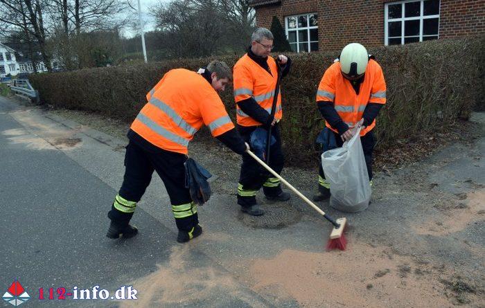 Spildet var på selve vejen og ind i en indkørsel så brandmændene gik straks i gang med “ kattegrus “ kost og skovl og fik på den måde styr på forureningen.