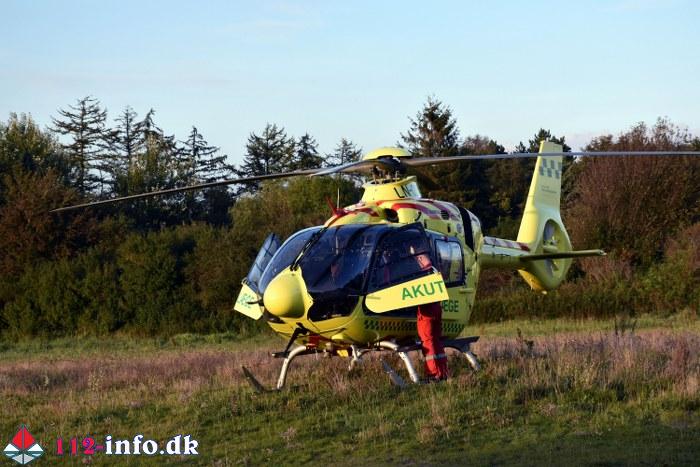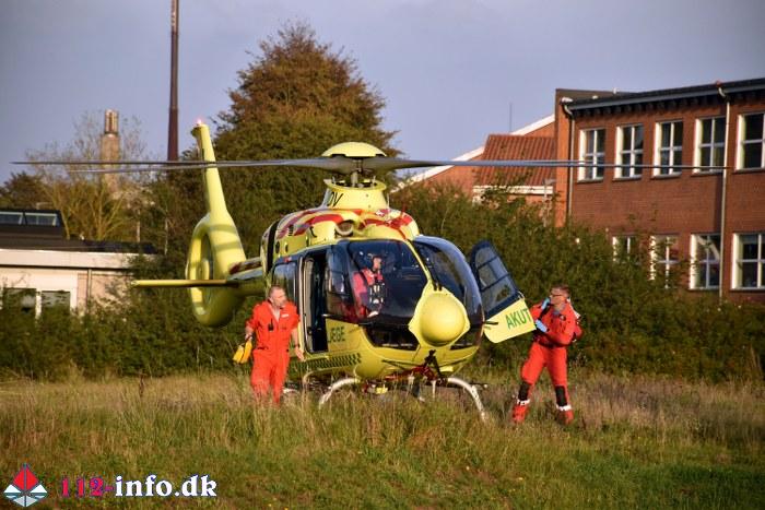 Lægehelikopteren landede på pladsen lige over for kirkehuset og her blev redningsmandskabet hentet i Akutbilen.